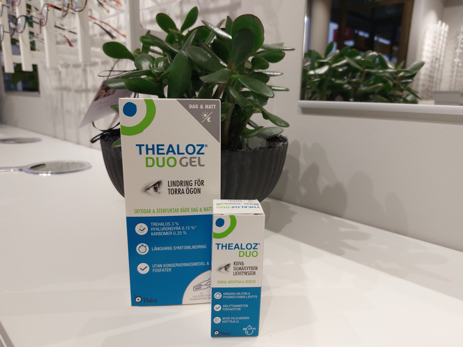 Kuivien silmien hoitopaketit. Thealoz Duo päivällä ja Thealoz Gel yöksi.