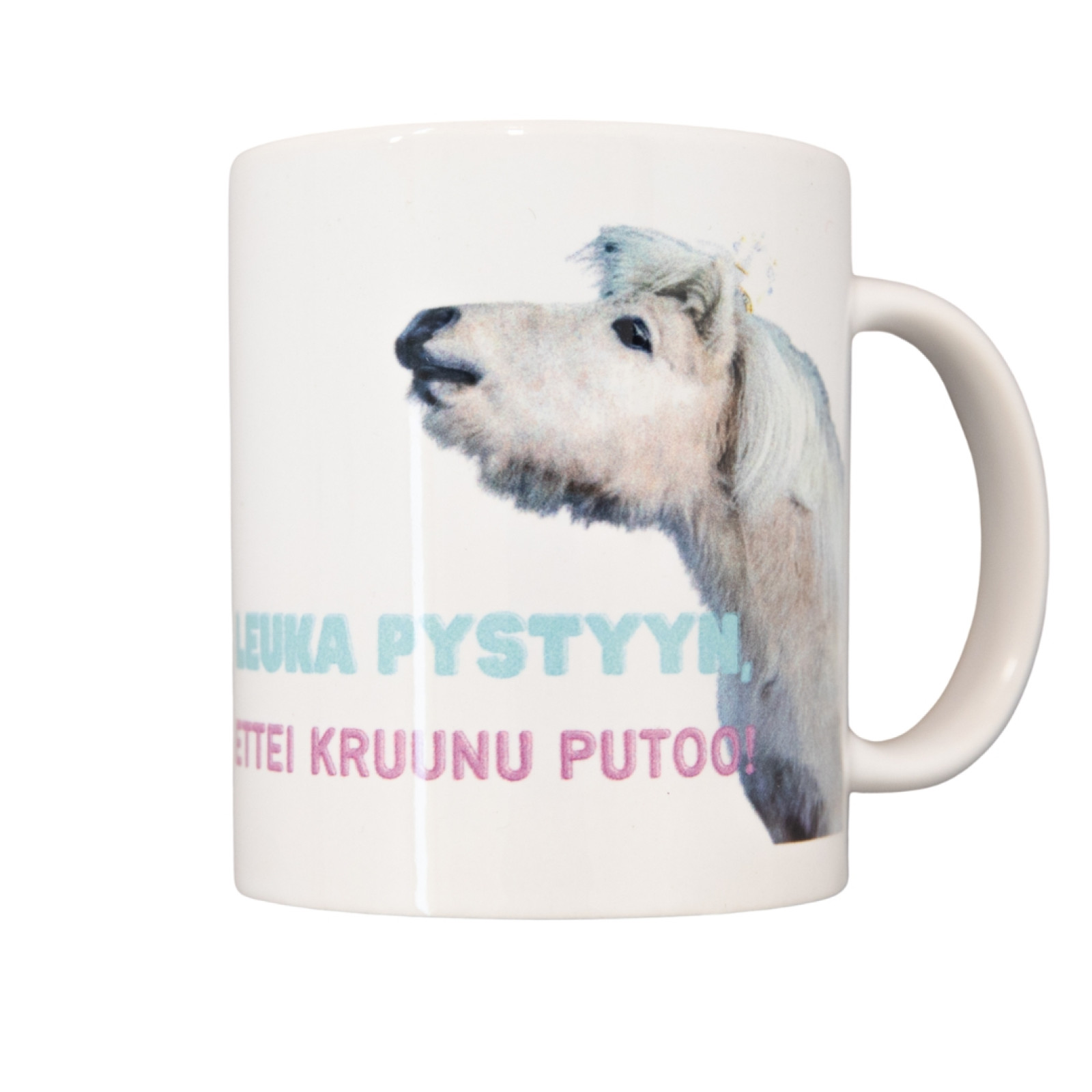 Pakettiin sisältyy 5 kpl Leuka pystyyn ettei kruunu putoo! -mukeja. Yhden mukin tilavuus on 350 ml. Mukit ovat konepestäviä.