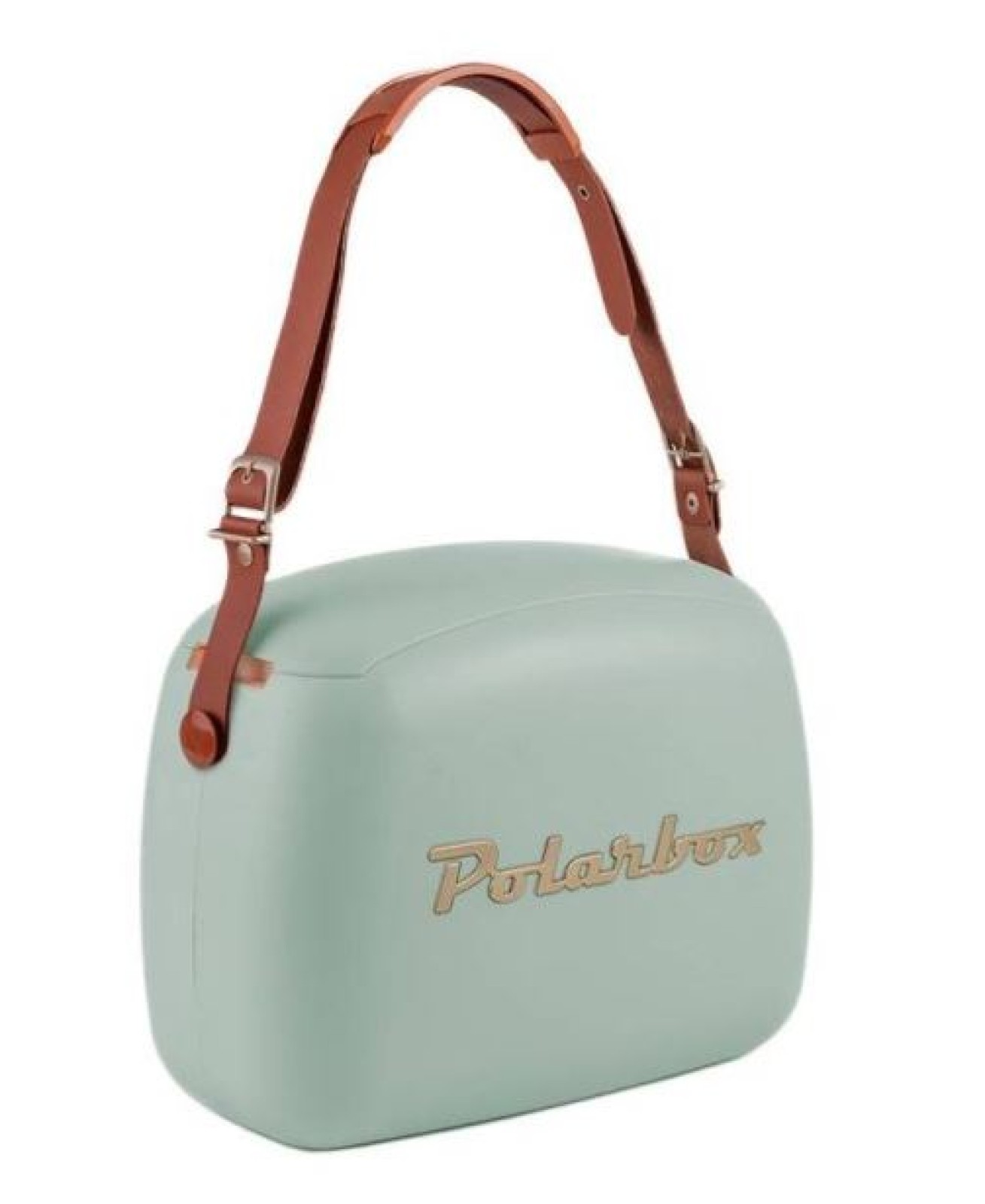 Laukussa on tyylikäs nahkainen kantohihna ja kullanvärinen Polarbox-logo.