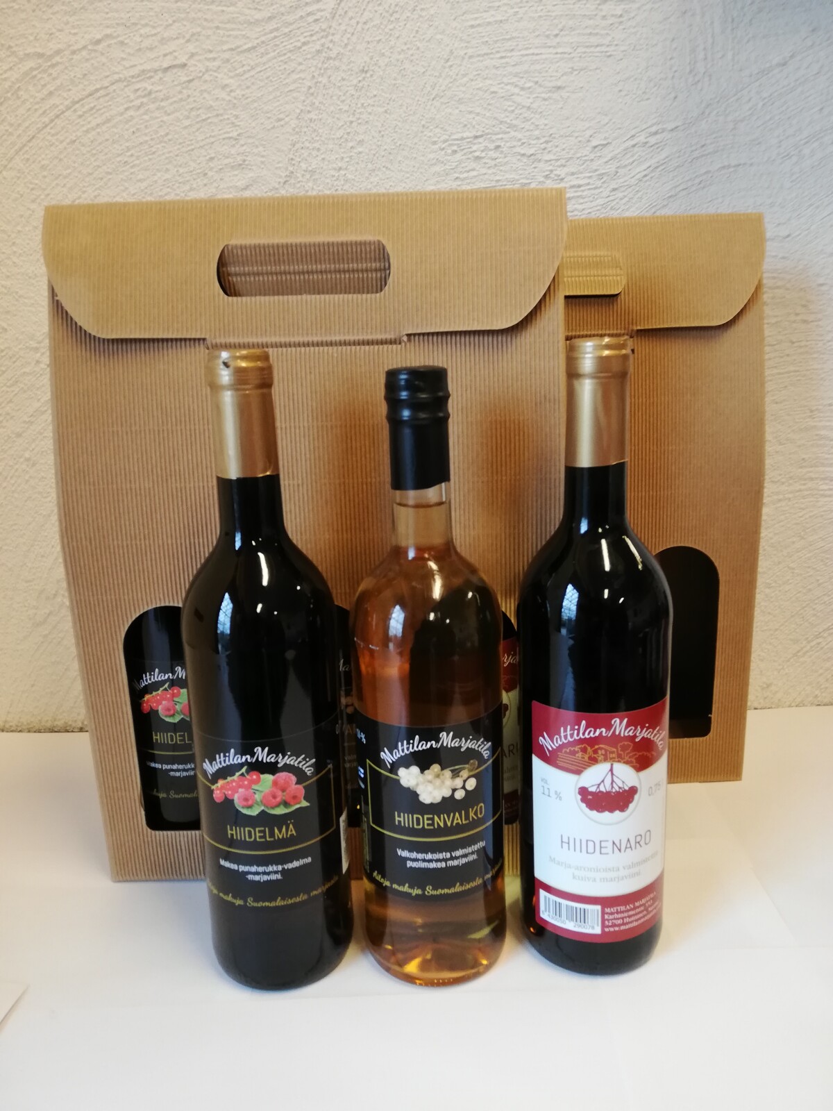 Mattilan Marjatilan viini six-pack sisältää Hiidenvalko 2x0,75l, Hiidenaro 2x0,75l ja Hiidenmusta 2x0,75l